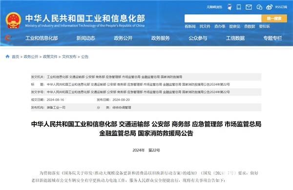 江南网页版2024年8月21日获悉,工业和信息化部、交通运输部、公安部、商务部、应急管理部、国家市场监管总局、国家金融监管总局、国家消防救援局等八部门近日联合发布公告,部署做好老旧新能源城市公交车辆安全有序更换动力电池工作,服务人民群众安全便捷出行。