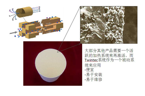 微粒过滤器的功能原理:当尾气流过这个微粒过滤器的交替封闭的通道时候,一氧化碳(CO)和碳氢化合物(HC)被氧化处理。那些从发动机来的只不过作为未燃烧的燃料被收集在过滤器中,然后通过一个催化反应被充分的燃烧。这个催化反应将通过一个陶瓷载体的涂层而引起。涂层中我们使用的是一个不同贵金属组合。根据不同类型的发动机,不理想的排放的减轻从230℃的峰值温度开始。平均温度能显著的降低。