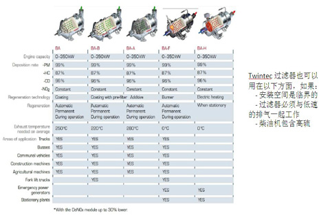 Twintec的DPF系统可以安装在客车,卡车和建筑车辆上。该系统通过一个稳定的热性能确保一个可靠的再生,即使在低排气稳定的时候。因此,对带有低的载荷周期的柴油发动机也能安装这个自清洁的微粒过滤器。