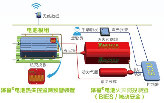 泽福®电池智能液体灭火系统,就是给车辆电池箱装上“灭火器”,实现对电池箱,电池仓、高压电器仓,电动机仓等车辆电器核心区的保护,在电池或电器部件出现热失控时,提前报警,并处置火情。