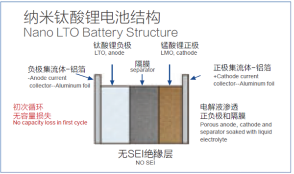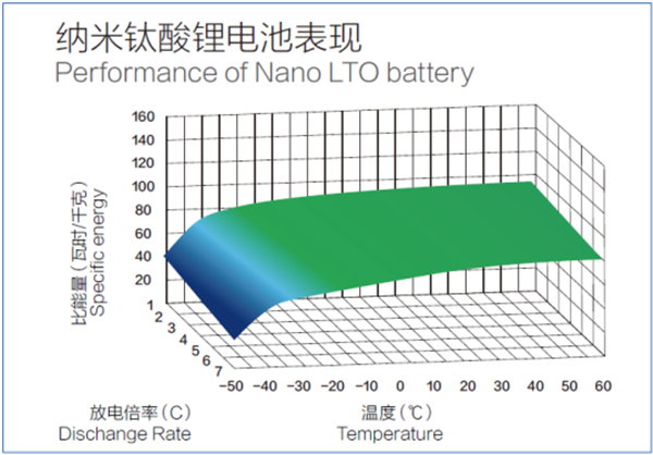 由于钛酸锂结构稳定,其尖晶石结构具有三维的锂离子扩散通道,且表面不形成固液界面钝化膜,在低温下各项动力学性能仍能保持常温时的状态,充电不会导致短路或者出现使负极恶化的锂枝晶,具备在-50℃极低温至60℃的超高温范围内完全充放电的能力。