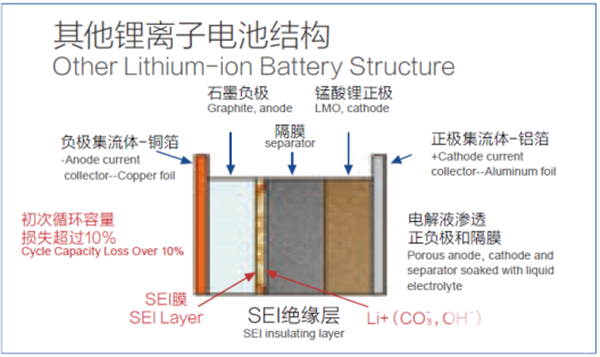 此外,石墨碳负极电池的电位与锂的标准电位很接近,对金属锂的电位为0.2V,电池过充时,金属锂可能在碳负极表面析出而形成锂枝晶,从而引发短路等安全问题。