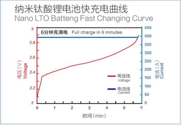 电池材料的倍率性能由离子导电性和电子导电性双重决定。钛酸锂材料具备三维的锂离子传输通道,具备高于石墨几百倍的离子电导率。由于纳米级钛酸锂的表面积大,电化学反应速度快,具备6-15分钟快速充放电能力,同时由于负极没有固液界面钝化膜,大电流工作时电池发热效应少。