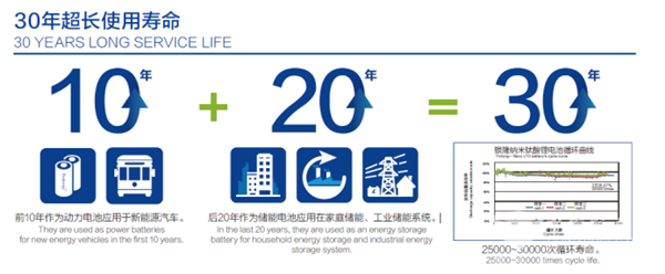 银隆纳米钛酸锂电池具有25000—30000次循环寿命,拥有30年超长使用寿命。前10年作为动力电池应用于新能源汽车,后20年作为储能电池应用在家庭储能、工业储能系统。