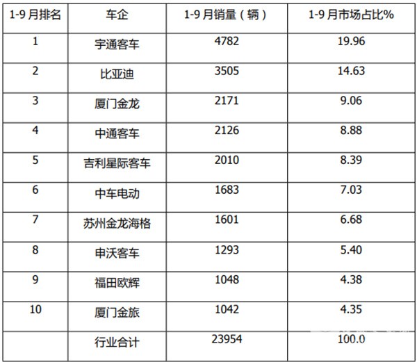 ---宇通、比亚迪累计销量均超出3000辆共同领跑行业(分别销售4782辆和3505辆),分别居第一、第二,市场占比分别为19.96%、14.63%;