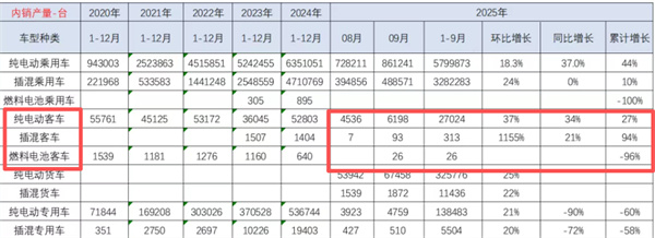 根据中国汽车流通协会数据(见截图1),2025年9月我国新能源客车产量为6317辆(纯电动客车6198辆+插电式混动客车93辆+26辆燃料电池客车,不含新能源物流客车,下同),同比增33%;2025年前9月新能源客车累计产量为27363辆(含纯电动客车27024辆+插混客车313辆+26辆燃料电池客车),累计同比增长28%。