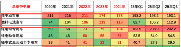 ----2025年第三季度纯电动客车单车平均带电量为:193.1KWh,而2025年一季度、二季度纯电动客车单车平均带电量分别为198.2和193.2KWh,均大于今年第三季度,说明目前新能源客车“大转小”趋势明显。