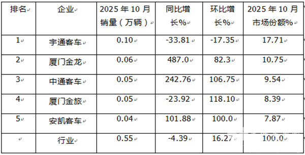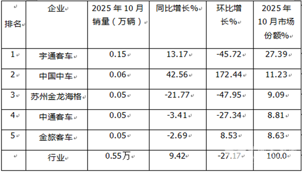 TOP5主流企业2025年10月中型客车销量、同比、环比及市场份额统计:
