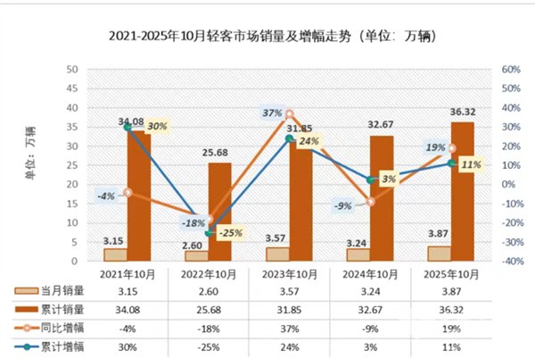 根据中汽协数据,2025年10月轻客销量3.87万辆,同比增长19.22%、环比下降11.37%,呈现了同比增、环比降的发展态势。