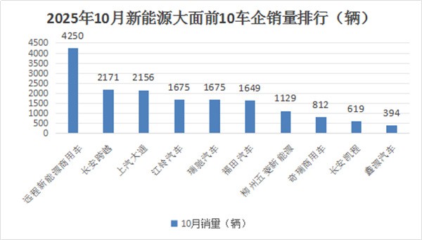 上图显示,在2025年10月新能源轻客中的大面车型销量中,远程以4250辆销量的绝对优势居榜首,长安跨越及上汽大通销量均超2000辆,分别居第二、第三。其余车企销量均在2000辆以下。