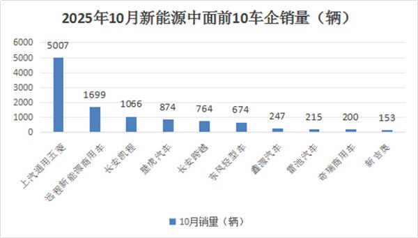 上图显示,在2025年10月新能源轻客中的中面车型销量中,上汽通用五菱汽车以5007辆销处于绝对的优势地位夺冠,远程及长安凯程销量均超1000辆,分别居第二、第三。其余车企销量均在1000辆以下。
