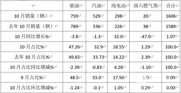 表4,根据终端上牌数据统计,按燃料种类划分,2025年10月考斯特客车销量结构及占比同环比增减: