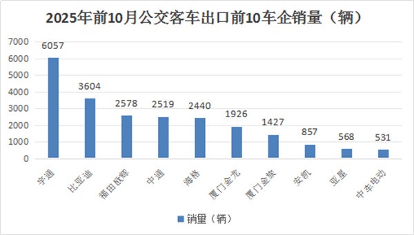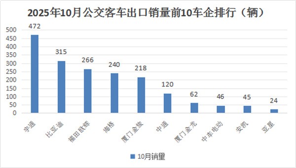 根据中国客车统计信息网数据,2025年10月我国公交客车出口前10车企销量及占比(含大中轻车型):