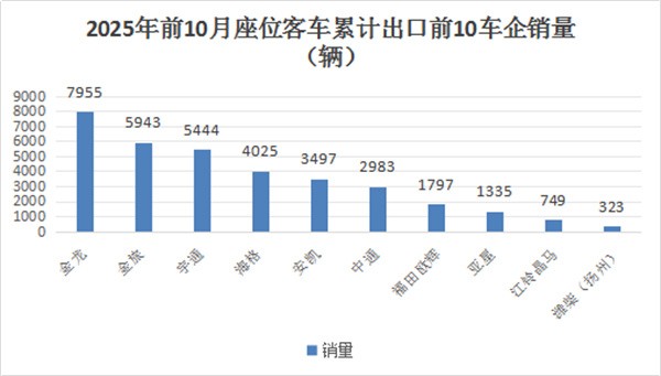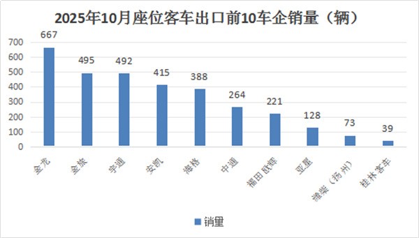 根据中国客车统计信息网数据,2025年10月我国座位客车出口前10车企销量及占比(含大中轻车型):