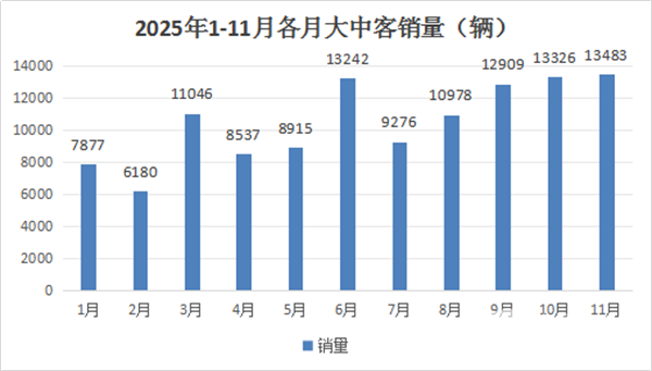 根据中国客车统计信息网数据,2025年1-11月各月我国大中型客车销量统计: