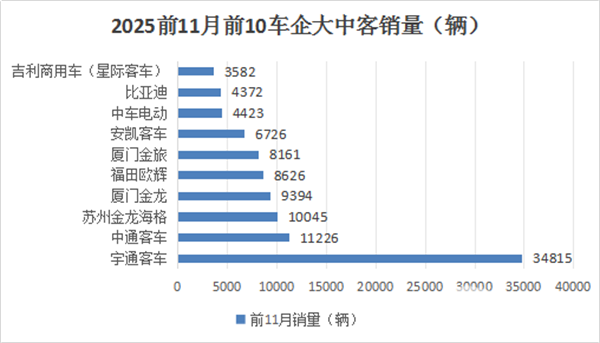 表2,根据中国客车统计信息网数据,2025年1-11月6米以上客车top10累计销量排行: