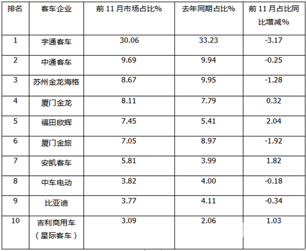 ---宇通客车市场占比30.06%,居第一,占比同比减少3.17个百分点;是占比减少最多的车企;