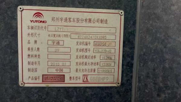 | 客车品牌 | 宇通客车 | 上牌时间 | 2015-08-18 |
