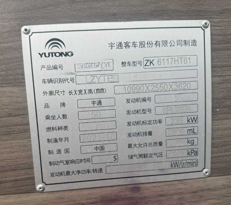 新到2021年11月上牌、国六50座宇通6117型客车,非营运性质,潍柴320马力、钢板缓速器、公司一手车。