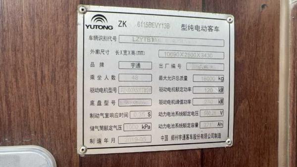 2019年6月 48座非营运宁德时代宇通6115新能源纯电客车