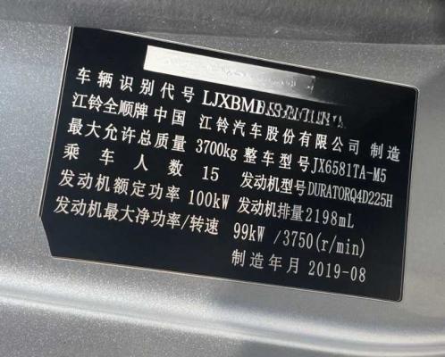 | 客车品牌 | 江铃全顺 | 上牌时间 | 2019-08-21 |