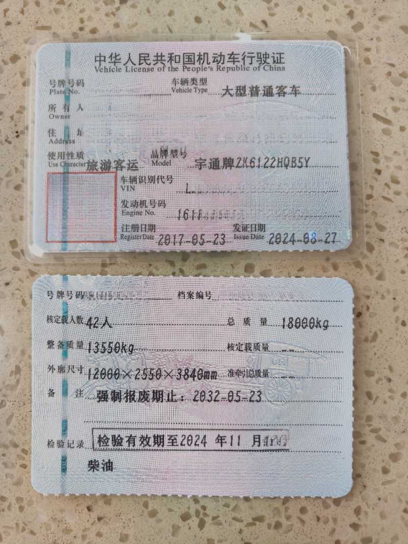 42座宇通6122型客车,2017年5月上牌,旅游客运性质,潍柴336机头,国五排放,定金留车。