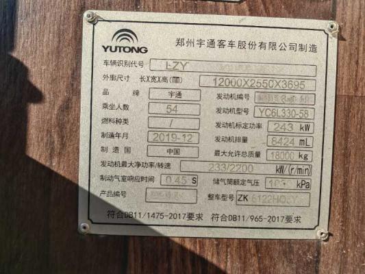 | 客车品牌 | 宇通客车 | 上牌时间 | 2019-12-11 |