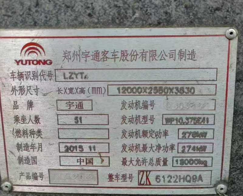 | 客车品牌 | 宇通客车 | 上牌时间 | 2015-12-11 |