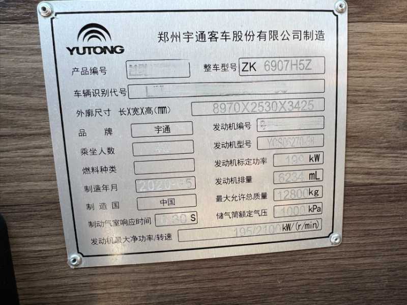 | 客车品牌 | 宇通客车 | 上牌时间 | 2020-06-11 |