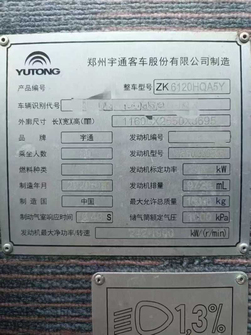 | 客车品牌 | 宇通客车 | 上牌时间 | 2020-08-18 |