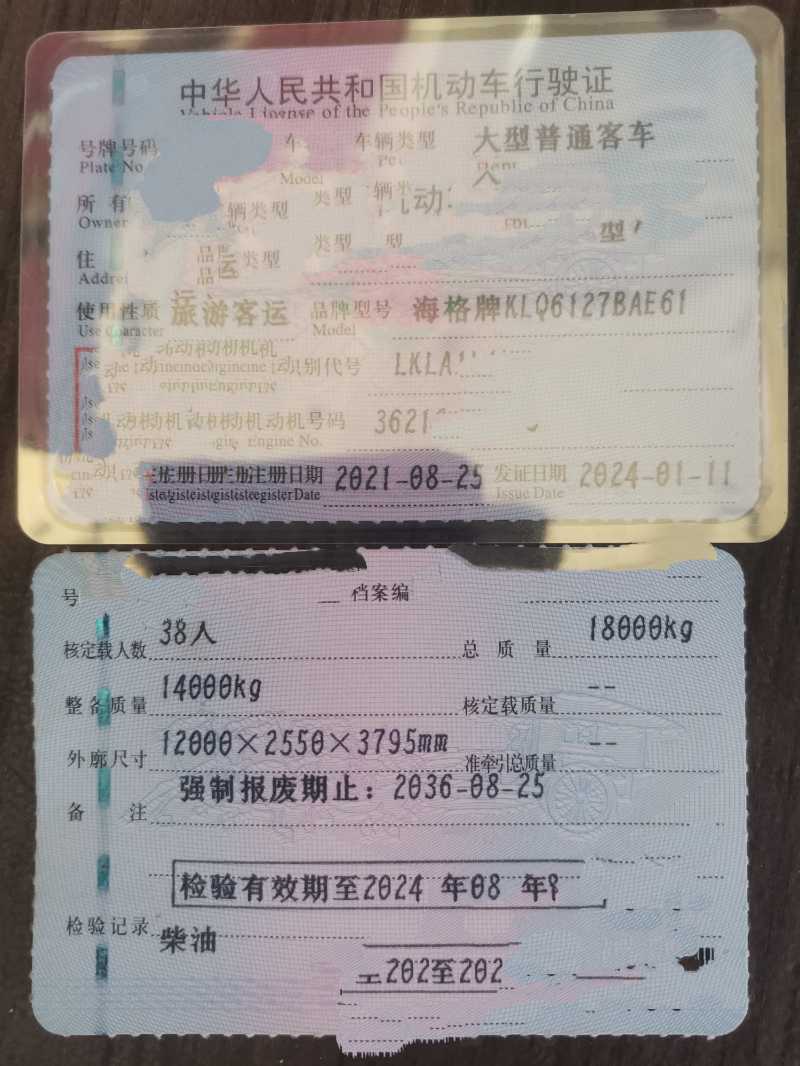 2021年8月上牌国六38座2+1海格6127带液缓气囊旅游车