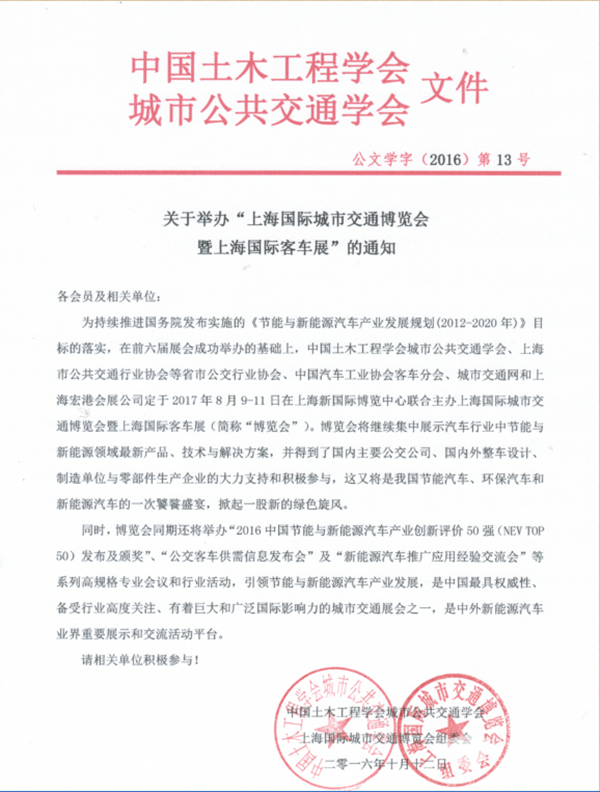 为持续推进国务院发布实施的《节能与新能源汽车产业发展规划(2012-2020)》目标的落实,在前六届展会成功举办的基础上,中国土木工程学会城市公共交通学会、上海市公共交通行业协会等省市公交行业协会、中国汽车工业协会客车分会、城市交通网和上海宏港会展公司定于2017年8月9日-11日在上海新国际博览中心联合主办上海国际城市交通博览会暨上海国际客车展(简称“博览会”)。博览会将继续集中展示汽车行业中节能与新能源领域最新产品、技术与解决方案,并得到了国内主要公交公司、国内外整车设计、制造单位与零部件生产企业的大力支持和积极参与,这又将是我国节能汽车、环保汽车和新能源汽车的一次饕餮盛宴,掀起一股新的绿色旋风。