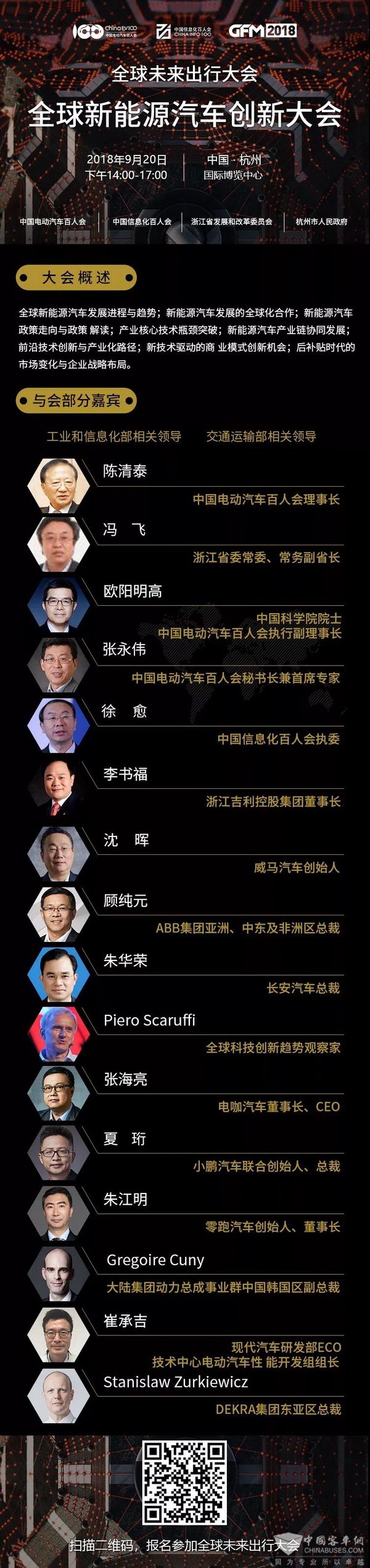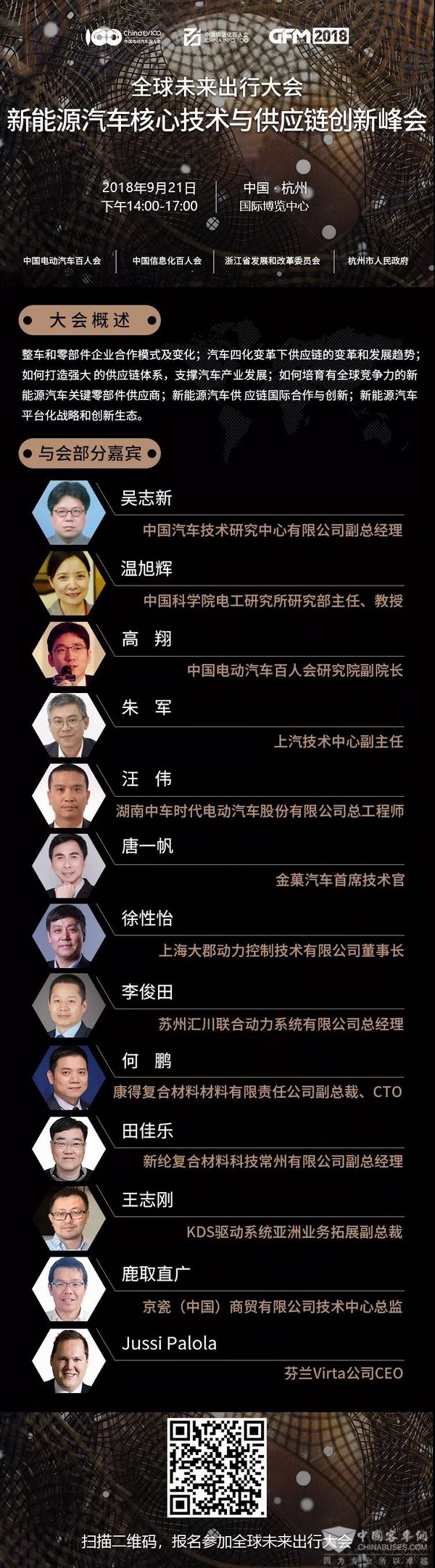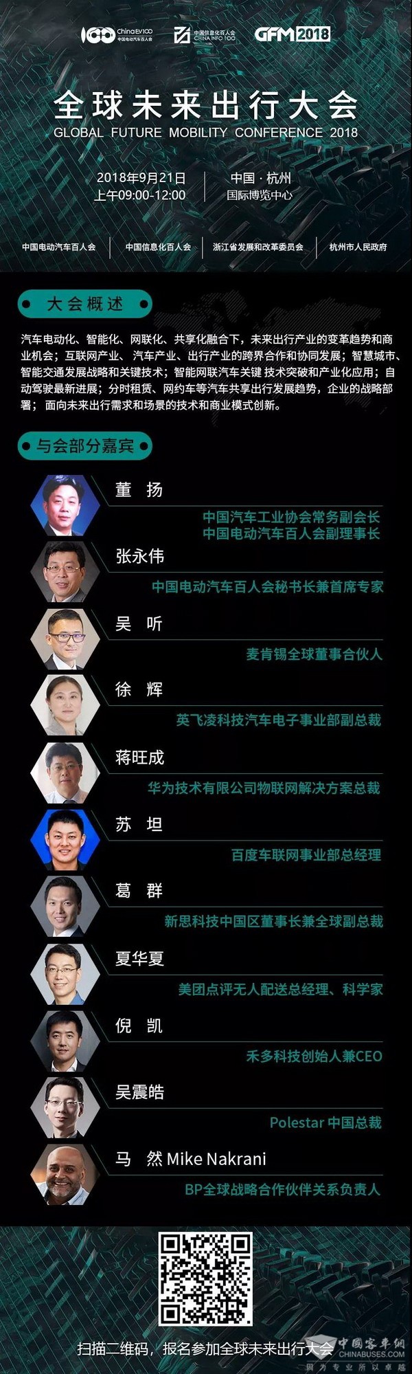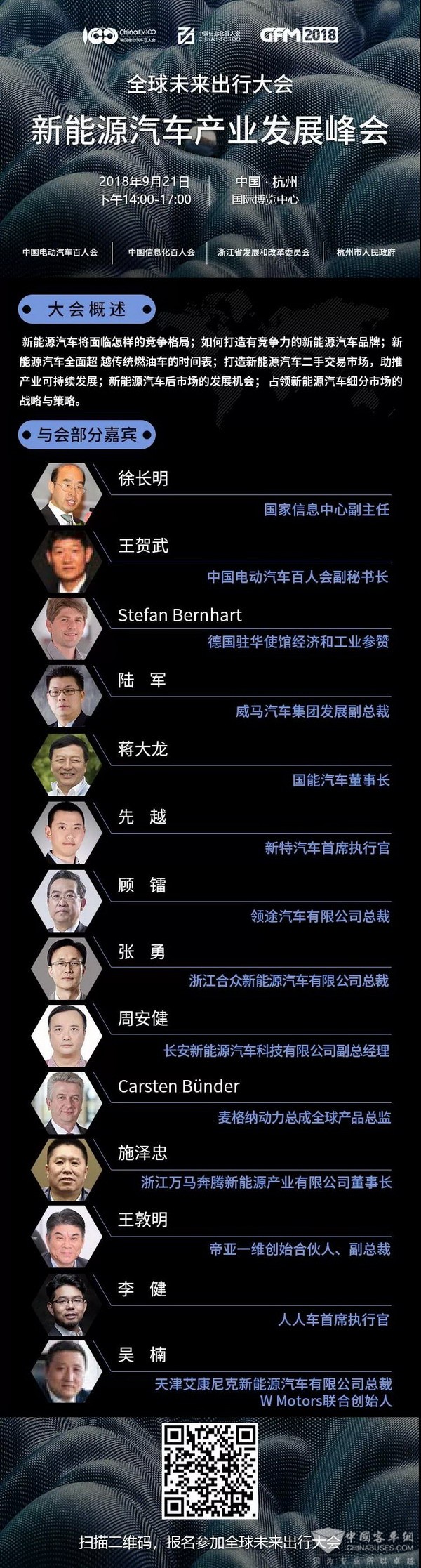 2018全球未来出行大会将于9月20 - 23日在杭州国际博览中心召开,本次大会由中国电动汽车百人会、中国信息化百人会、浙江省发展和改革委员会杭州市人民政府共同主办。