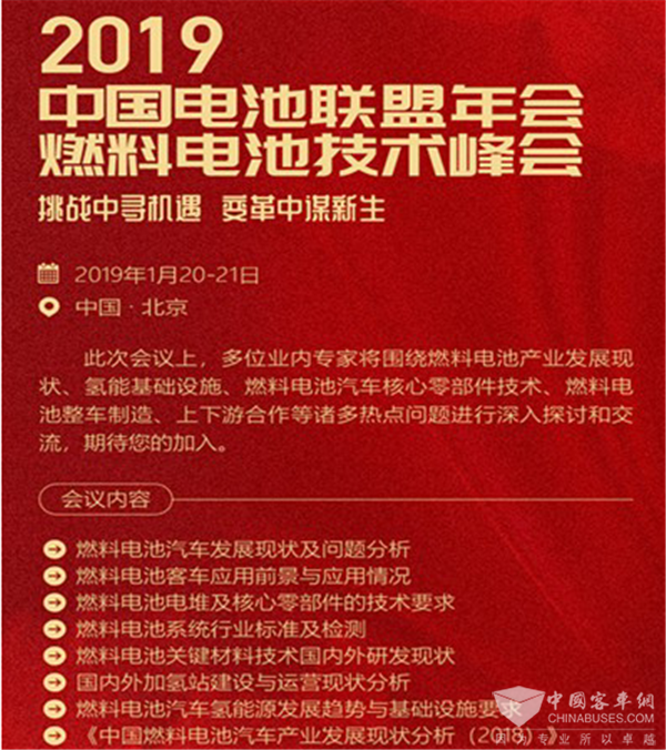 2019年1月20至21日,中国电池企业联盟年会暨全国氢燃料电池汽车产业技术峰会将在京召开。本次峰会由中国电池联盟、中国电子节能技术协会电池专委会、中国高科技产业研究会、清华大学、北京理工大学联合举办。