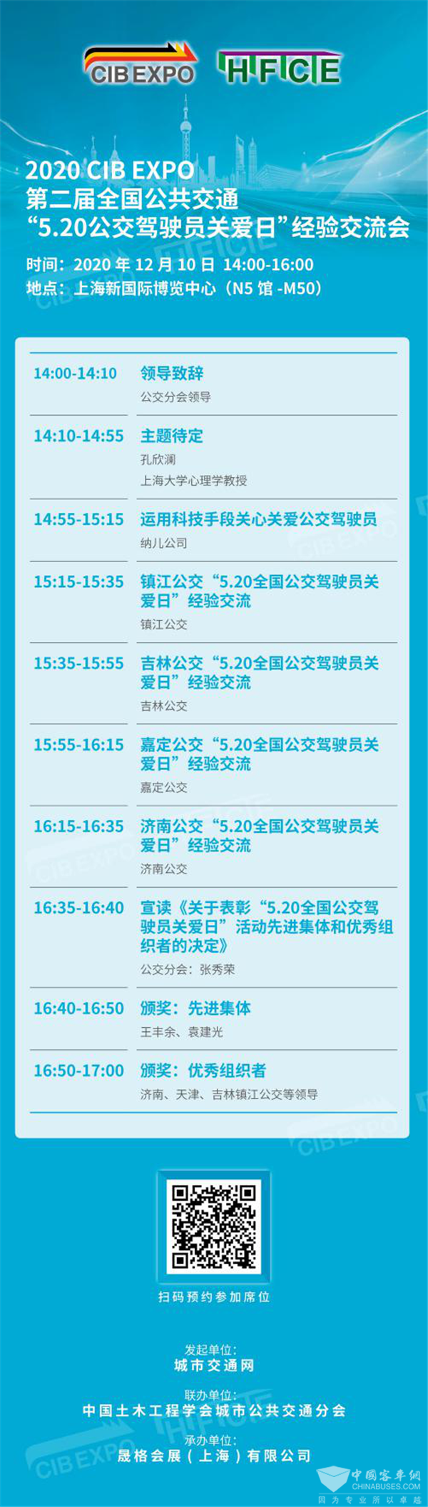 为进一步营造全社会关心关爱、理解尊重公交司机的良好氛围,让理解与尊重同行,由城市交通网发起,中国土木工程学会城市公共交通分会主办、晟格会展(上海)有限公司承办的第二届全国公共交通“5.20全国公交驾驶员关爱日”经验交流会将于2020年12月10日在上海新国际博览中心隆重举行。