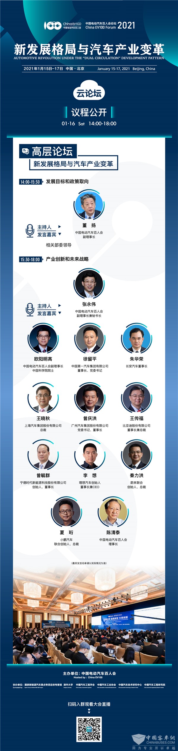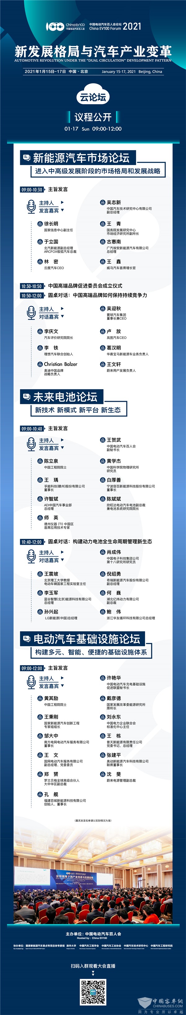 中国电动汽车百人会论坛(2021)将于1月15-17日举办,大会主题聚焦“新发展格局与汽车产业变革”,3天会议期间共设置2场高层论坛以及7场主题论坛。根据北京市及钓鱼台国宾馆防疫要求,不允许举办100人以上的集会活动。本届大会取消线下参会报名,取消现场听会观众,百人会欢迎各界嘉宾采取观看视频直播的方式远程参会。
