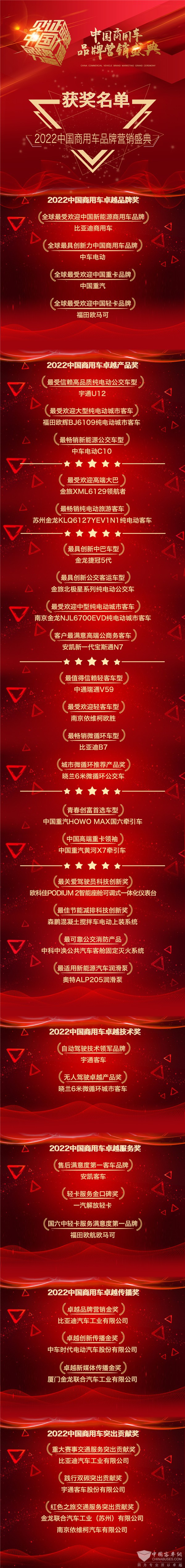 传时代强音,展大国品牌风采。2022年8月8日,由中国客车信息网、中国卡车信息网、牛车商用车、第1新能源车网联合举办的“见证品牌力量——2022中国商用车品牌营销盛典”在北京成功举办,活动聚焦中国商用车优秀品牌文化传承,为行业引领力量颁布多个重磅奖项,通过表彰卓越,弘扬优秀,为行业发展树立榜样、注入活力。