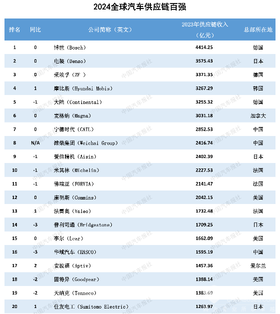 在“全球汽车供应链百强”名单中,多家国际知名汽车零部件供应商在列。其中,博世、电装、采埃孚、摩比斯、大陆等企业凭借技术创新能力和全球布局,继续稳居全球百强前五位。