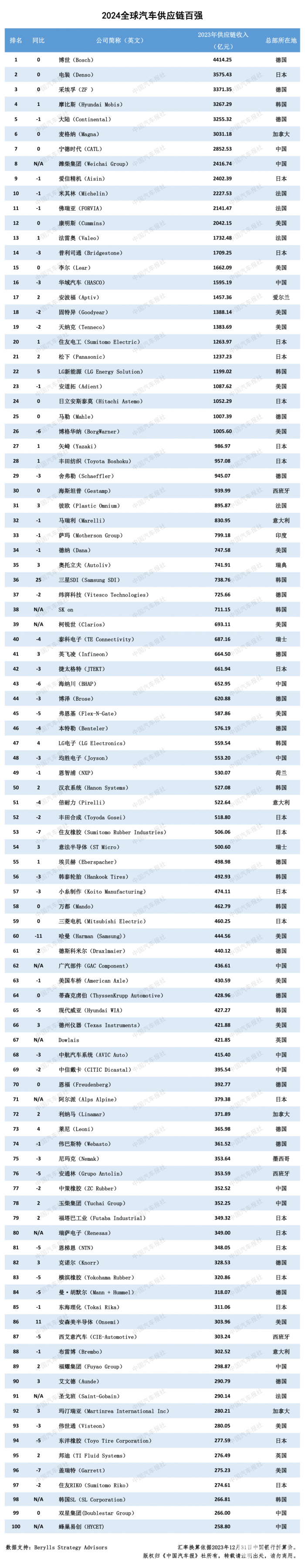 2024年8月22日,由《中国汽车报》社和罗兰贝格联合编制的《2024全球汽车供应链核心企业竞争力白皮书》(以下简称《白皮书》)正式发布。其中,“全球汽车供应链百强”和“中国汽车供应链百强”两份名单,更是引起了业界的广泛关注。