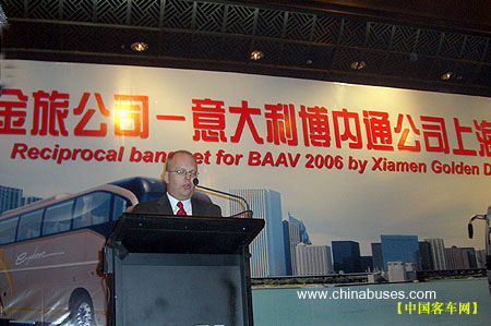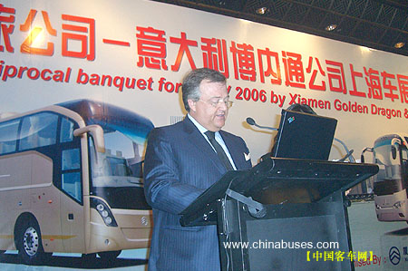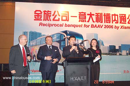 在庆典仪式上,意大利博内通公司博内通先生首先发表致辞,“意大利博内通公司与厦门金旅这次出色的合作,不仅仅是我们提供了设计,同时也是厦门电力工程师的高度热情,及国内设计师的专业精神合作上的一次伟大成功。意大利博内通的出色设计不是模仿成功公司成功的共识和模式,而是不断的努力达到目的,依靠不间断的研究和耀眼的文化,是一直鼓励去开拓新的方法和方式去表达真正的意大利传统设计。”博内通先生还提到,这款“开拓者”高档客车,是一个典型的融合了中国和意大利两个不同文化的历史,意大利和亚洲的历史,该客车具有很强的市场竞争力。