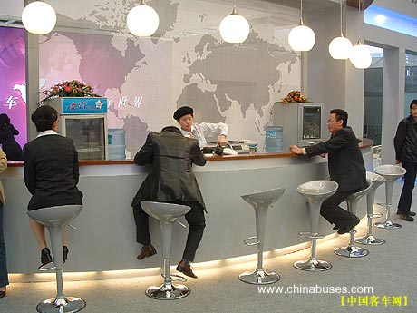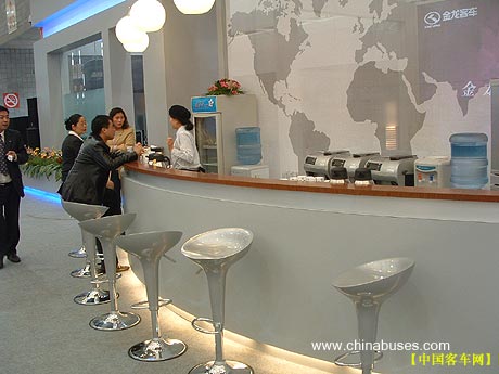 这次大金龙展台是国内首次采用了欧式展台的布局,在展区里面开辟了一块空地,铺上地毯,放上沙发和桌子,设立吧台,在周围放上展出的车型,这样,参展观众们就可以一边喝着咖啡,一边细细评赏新车,一举两得。