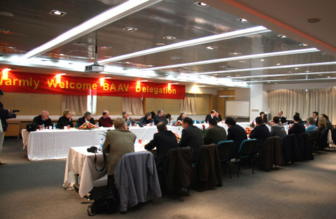 苏州金龙总经理吴文文与BAAV官员在会议室进行座谈