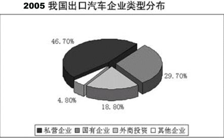 据海关总署提供的数据显示,2005年,汽车出口的增加,得益于私营企业出口激增。2005年我国私营企业出口汽车50.9万辆,增长3.7倍,占当年出口总量的46.7%;国有企业出口32.3万辆,增长83.5%,占29.7%;外商投资企业出口20.5万辆,增长1.1倍,占18.8%。整车出口中取得突出成绩的企业依次是:本田汽车(中国)、长城汽车股份有限公司。重型汽车集团(山东)进出口公司、一汽汽车集团进出口公司、东风汽车(含下属子公司)、奇瑞汽车、江西江铃、哈飞汽车、中国航空进出口公司。陕西重型汽车有限公司、河北中兴汽车、江淮汽车公司、上海吉利美嘉峰贸易公司、厦门金龙汽车、北汽福田、长安汽车、中国水利水电建设集团、跃进汽车集团、郑州宇通客车等。由此可以看出自主品牌的汽车仍然是我国汽车出口的主力军。