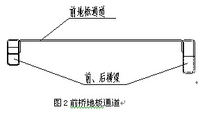而在前桥正上方区域考虑到需要留给前桥跳动空间及底盘管路线束布置空间,此处地板通道直接采用冲压槽形钢板件与前、后横梁连接。见图2所示
