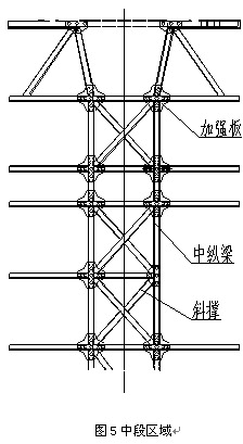 纵梁与横梁相交的区域通过加强斜撑将左右中纵梁及横梁焊接成一体来增加底架整体强度,同时所有横梁均与车身侧围立柱及顶盖横梁相对应。见图5所示