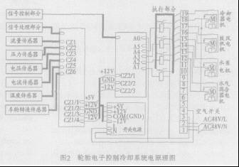 如图2所示,电路系统部分包括开关电源、温度传感器、车速传感器、电流传感器、电压传感器及ECU等。开关电源给系统供给稳定的电源;温度传感器提供信号给ECU判断是否控制冷却系统工作;车速传感器提供信号给ECU,ECU根据经验试验数据和车的本身参数(如轮胎的比热值、车辆质量等)判断在此车况下车辆行驶时轮胎能达到的温度,以及计算相应的热值;ECU通过电流传感器和电压传感器提供的信号精确控制电流和电压的大小,自动控制制冷器、鼓风机、水泵和水气混合器电机的功率和转速;喷头处压力和流量传感器通过控制混合物的压力和流量的值来控制水气混合物的量,达到最佳化的喷量。传感器的电源为经过处理的稳定电源,保证电源稳定可靠。