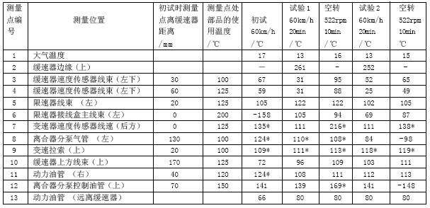 测量缓速器在最恶劣工况工作时其周边零部件、管及线路离其最近点的最高温度,从而根据所获数据拿出相关防范缓速器热害的对策。