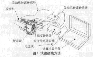 在车上缓速器周边的零部件、管路及线路上取点(离缓速器距离最近)放置传感器,传感器通过导线与温度转换器连接,温度转换器把传感器感应到的热量通过相关的软件在计算机上显示出感应点处的温度变化情况,最终获得最高温度值。增加发动机转速感应导线后,同时可显示出各温度值对应的发动机转速,试验接线方法见图1。