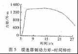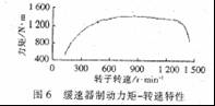图5为制动力矩-时间特性曲线,图6为制动力矩-转速特性曲线。从图6中可见,制动力矩在转速(800~1000)r/min左右达到最大,最大值为l418.4N·m,可满足设计要求;在制动初始阶段,制动力矩随着转筒转速的提高而迅速增加;在持续制动阶段,制动力矩变化不大;随着制动时间增加,转筒温度进一步增加,制动力矩下降显著。