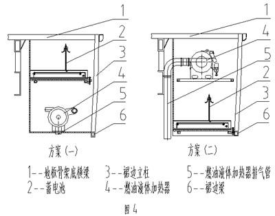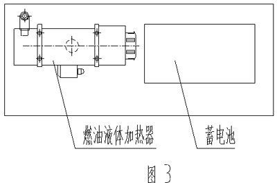 3.2 燃油液体加热器布置型式 燃油液体加热器布置型式很多,通常根据不同车型的总布置要求采用不同布置型式。一般情况下燃油液体加热器是布置在独立的仓体内,但有时也与蓄电池布置在同一仓体内。当燃油液体加热器与蓄电池布置在同一仓体内时通常有两种方案,第一种是燃油液体加热器与蓄电池并排布置如图3所示,这种布置方式适合于燃油液体加热器仓体在高度方向尺寸较小,而在车身前后方向尺寸较大时,优点是燃油液体加热器、蓄电池布置的重心都很低,便于安装、维护、检修等,相对的维护费用较低;第二种是燃油液体加热器、蓄电池重叠布置,如图4所示,这里又有两种方案,方案(一)是蓄电池上置燃油液体加热器下置式,方案(二)是燃油液体加热器上置蓄电池下置式,由于方案(二)相对方案(一)来说燃油液体加热器的排气管、滴油管处理难度大,所以方案(二)并不多见,但方案(二)中蓄电池重心低安全可靠,省去了方案(一)中蓄电池防护措施等,同时蓄电池便于安装、维护、检修等,相对的维护费用也较方案(一)低很多。